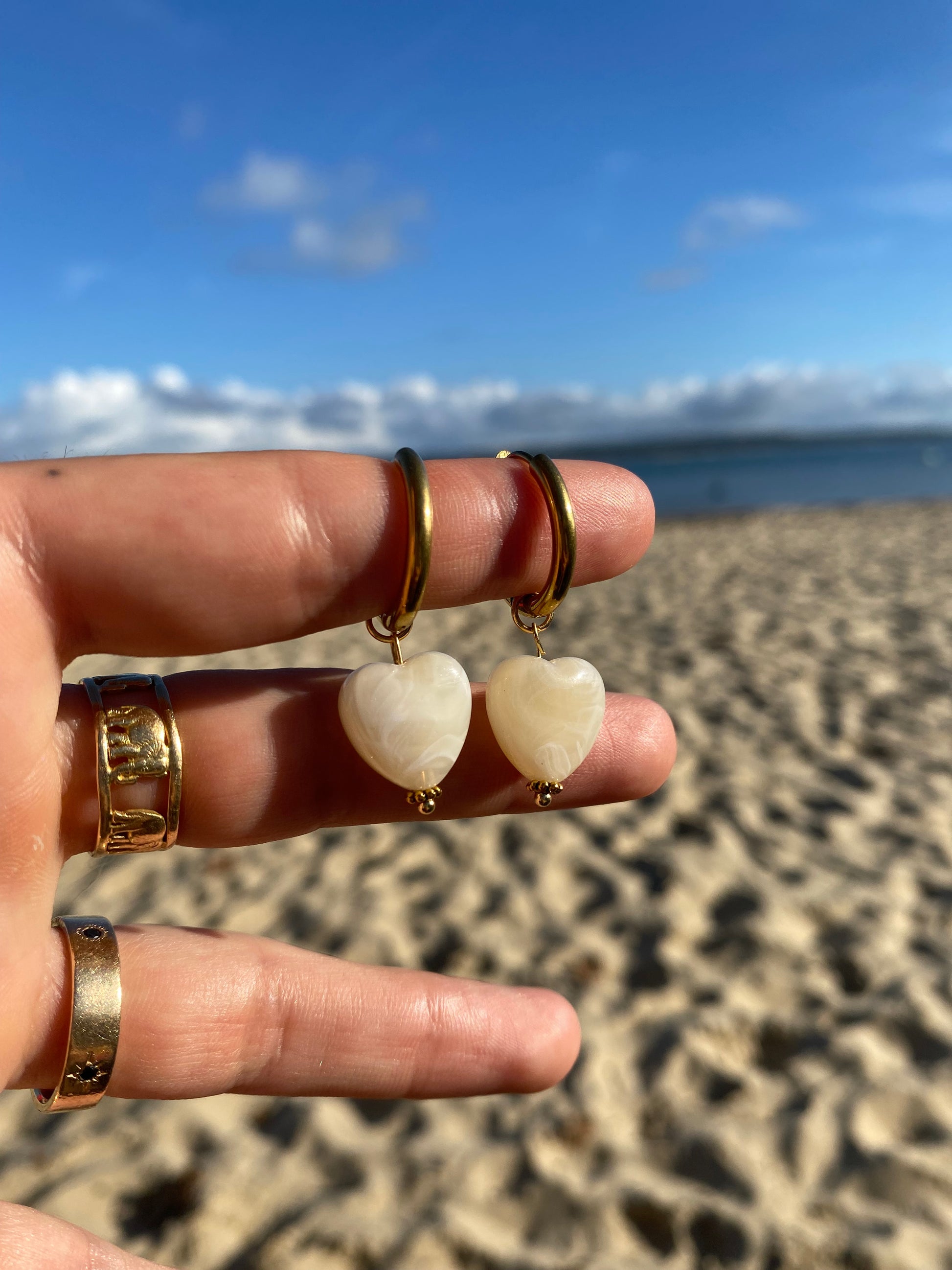 Ajoutez une touche d’élégance et de douceur à votre look avec les créoles Gloria. Ces boucles en acier inoxydable de haute qualité sont ornées d’un pendentif en forme de cœur, en acrylique beige, qui apporte une délicatesse subtile à votre style.