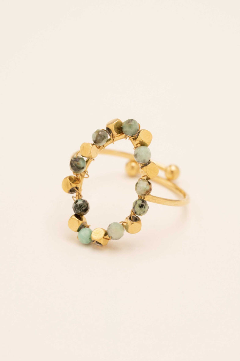 La bague Ortha est en acier inoxydable composée d'un anneau en forme d'amande, serti de perles en acier inoxydable et de petites pierres naturelles.
